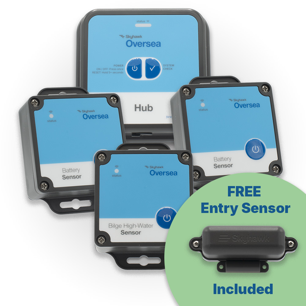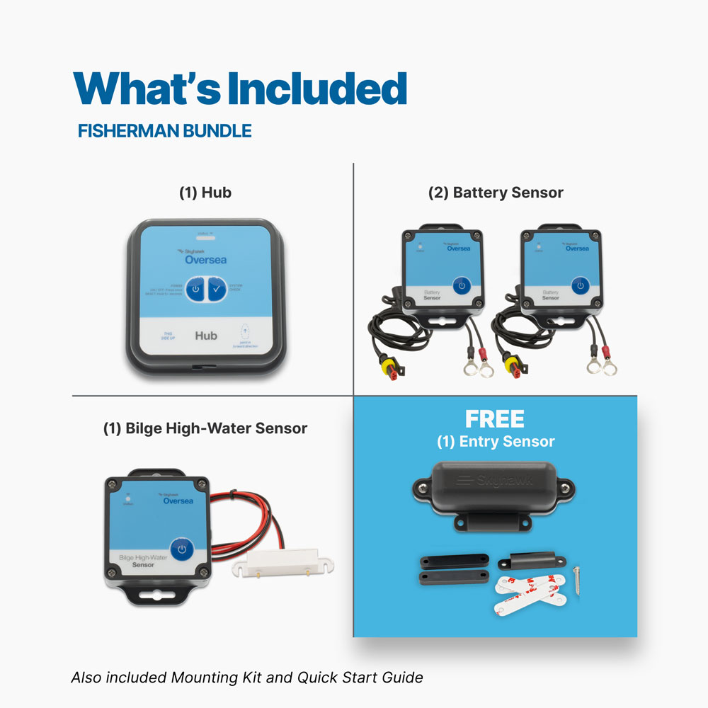 Fisherman Bundle includes: (1) Hub, (2) Battery Sensors, (1) Bilge High-Water Sensor, + (1) FREE Entry Sensor