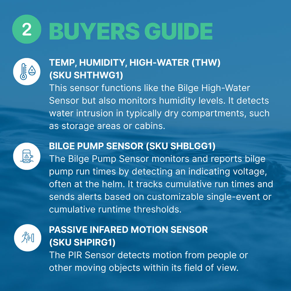 - Long-range sub-GHz RF connections to sensors allow monitoring of multiple boats hundreds of feet apart from a single Hub — ideal for multi-boat households and “dock buddies”