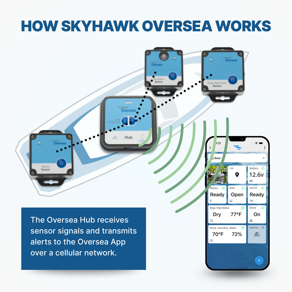 Because the Hub and all sensors are battery powered, Skyhawk Oversea delivers year-round monitoring with no drain on the boat’s batteries. It’s perfect for boats of all types and sizes, where they’re stored in a marina, on a trailer, on a home dock or boat lift, or even on a mooring. With boats spending most of their time in storage, Skyhawk Oversea provides owners with continuous peace-of-mind without wearing down the very batteries you need to enjoy your boat when the opportunity comes.