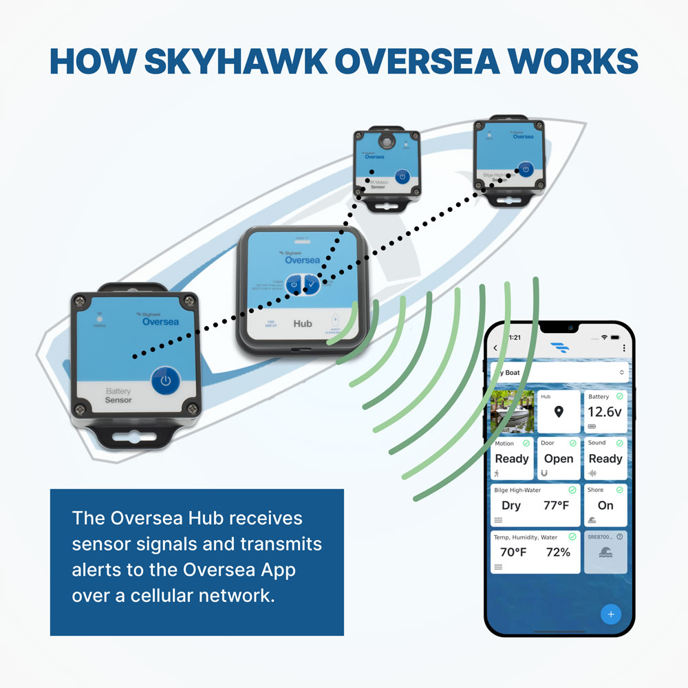 Because the Hub and all sensors are battery powered, Skyhawk Oversea delivers year-round monitoring with no drain on the boat’s batteries. It’s perfect for boats of all types and sizes, whether they’re stored in a marina, on a trailer, on a home dock or boat lift, or even on a mooring.